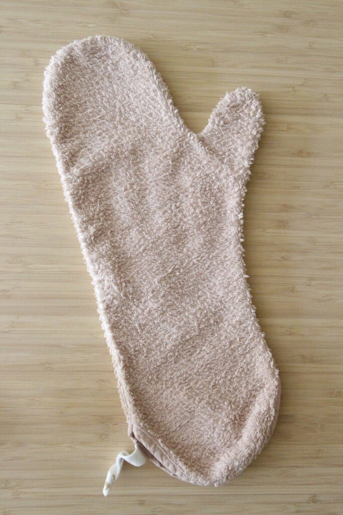 - Een baby wordt onder de douche nogal glibberig, daarom gebruiken wij een speciale douche-handschoen (zie foto hieronder) om ervoor te zorgen dat we meer grip hebben.